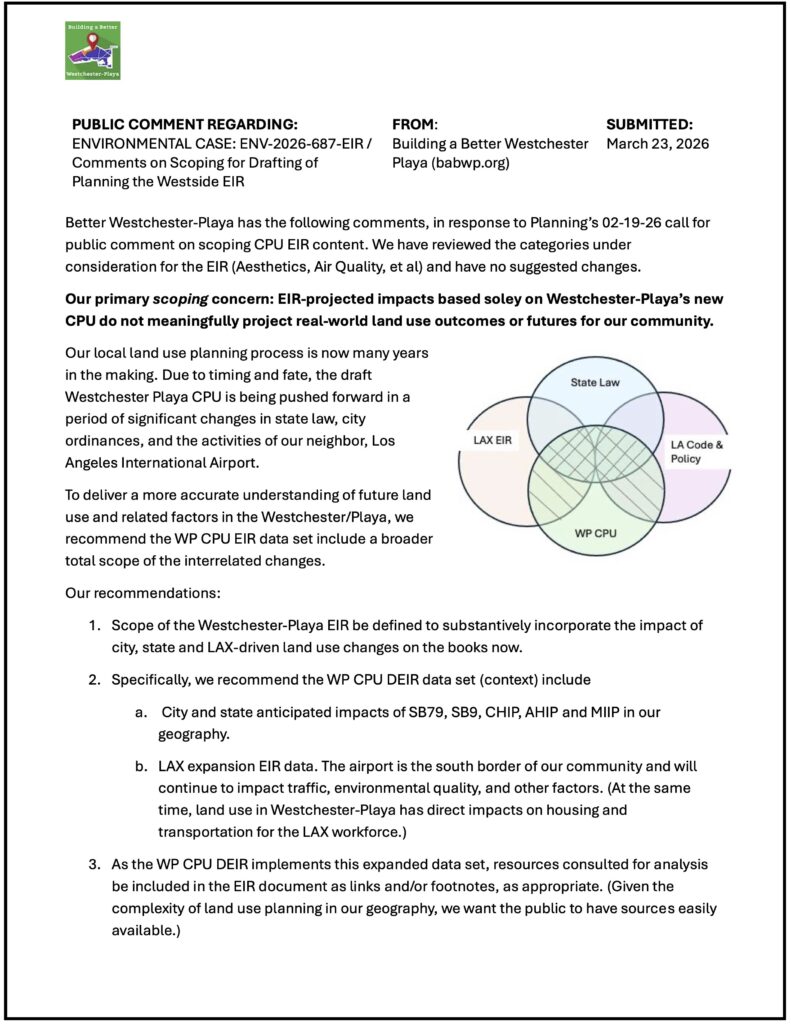 BaBWP submitted a public comment to specifically address the issue of multiple planning impacts beyond simple Westchester-Playa geography: