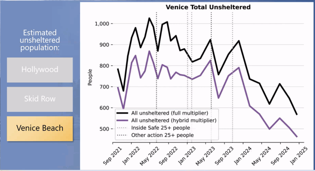 RAND researchers reported that Venice’s decline in their last study (2023) is attributed to successful Inside Safe supportive housing placements. In this latest report, the 25% decline is directly related pushing RV dwellers out of this community, not housing placements.